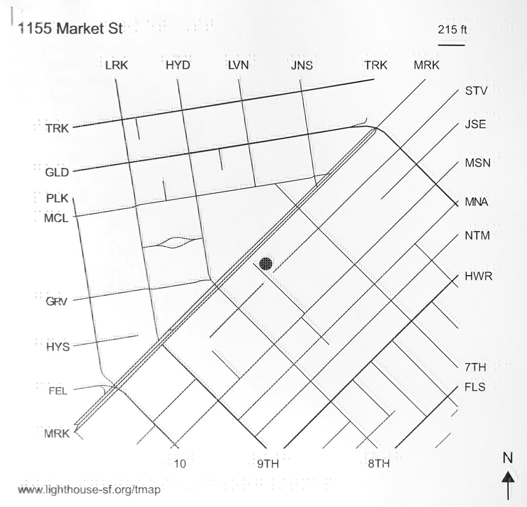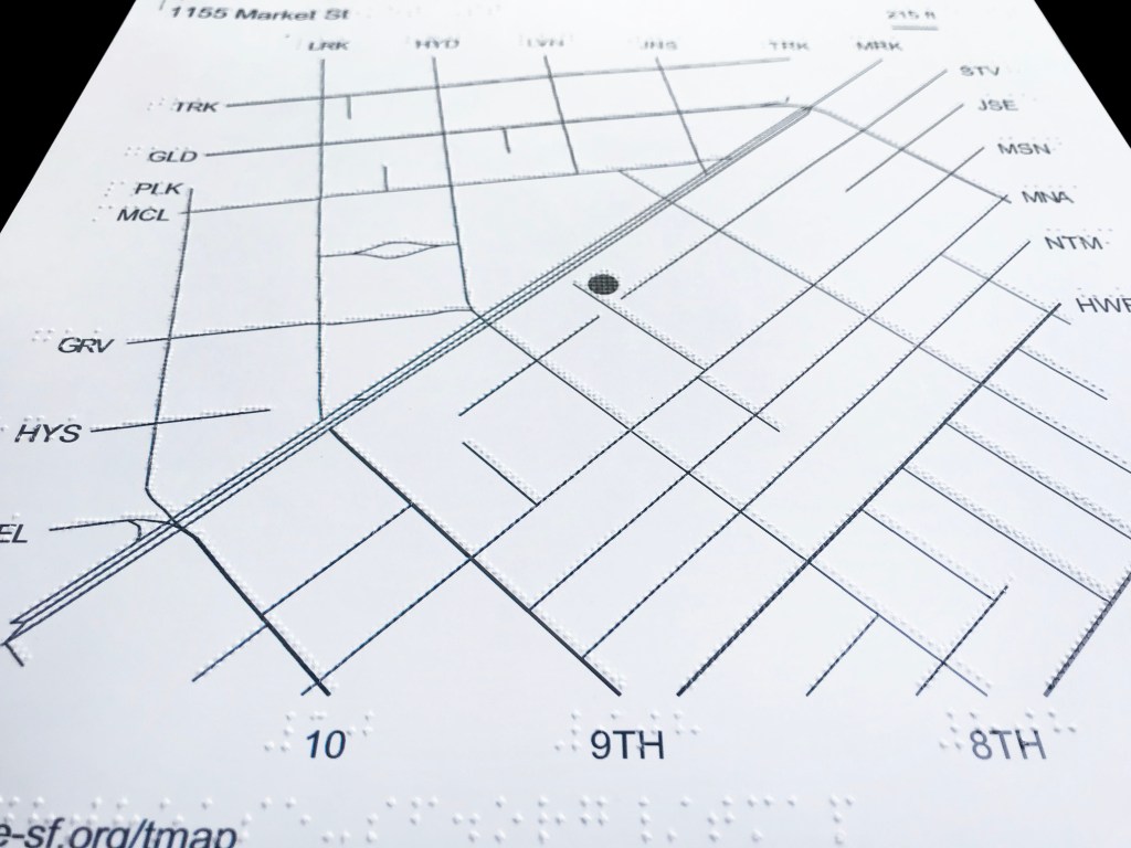 The maps below were produced at LightHouse for the Blind in San Francisco. The street maps are by TMAP (Tactile Maps Automated Production), an automated mapping tool that generates tactile map files with unprecedented speed, cost, and usability.